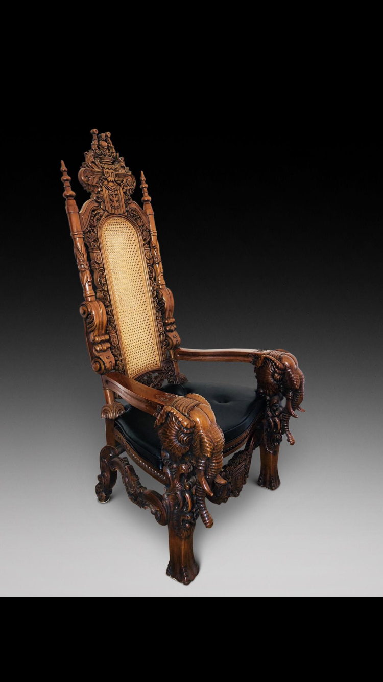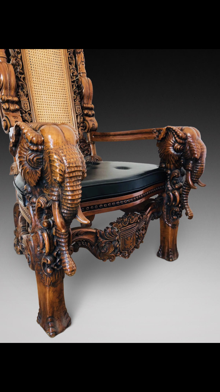 These are a pair of very impressive heavily carved arm chairs, caned backs and seats with black hide buttoned cushions.